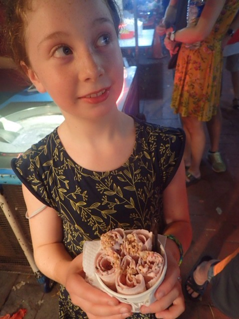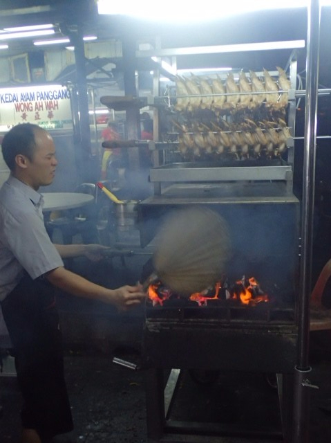 The famous street Jalan Alor, normal street by day, people and hawker stands by night, is the place we go to eat nightly. We already have our favorites. Chicken Satay, spring rolls from the Dim Sum cart, Fried ice cream, beer for $1 and Thai green curry. It is an overwhelming mix for the senses. A melange of no less than three pop songs, petrol fumes, charcoal smoke and a rotting whiff of Durian mixed with fish sauce.