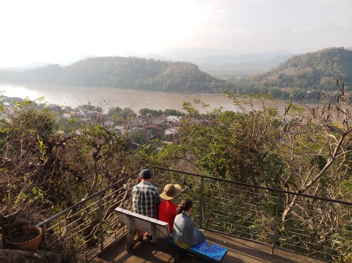 Our Guesthouse A saving grace is that although water stained and cracked, the ceilings are high and there is a window. Each room has carpet from the 1990s and threadbare sheets over single rock hard mattresses with heavy pillows that are weighed down by years of use. I am choosing to believe that everything is old and dingy, but clean? Recently? The outlets spark and lights flicker when you use them, but our doors go directly outside so escape from fire is quick. The bathroom is wet and smells sulfurous, the sink drains directly on the floor…however the shower water is warm, initially. Cork plays Jazz on his speaker and just having the music playing gives the place a sort of drug induced artist charm, one could even say Bohemian if you blur your vision by removing your glasses. Well after our first night’s sleep, no tell-tale bites. (I keep my fears and concerns to myself as the kids only complaint is that the WIFI is slow…which is the usual in all of Laos). I feel like this is a good test of my priviliged snobbery. However, two nights are adequate and tomorrow we move to a different guesthouse that we found along a quiet street near temples and our favorite restuarants. We worked out a discount and got the room down to $15 each a night and I am very happy to move there!