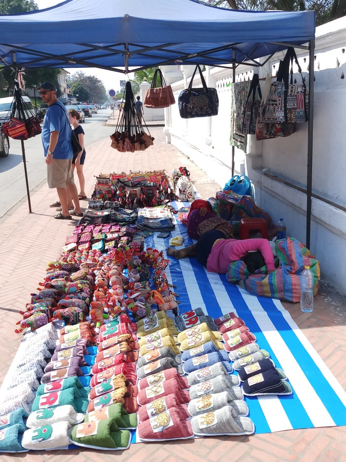 Laos is poorer, dirtier and rougher than Thailand. But along with this grime emerge old French villas next to large gold buddhas, amazing photo opportunities around every corner. We have observed in both Laos and Vietnam, countries with communist leadership, there is a tolerance for trash and rubble piles on the sidewalk and along the road. Our guess is maybe there less a sense of private responsibility as everything is owned collectively, or infrastructure and garbage collection are the government’s responsibility? Since we only scratch the surface in our understanding of the different places we visit we never really know. Filled with plastic bottles. Recycling I hope. Also, the capitalist drive to improve customer service and make money is literally asleep here, as shop keepers nap in their stores, often having to be wakened to buy something. The pace of service is very relaxed and slow.