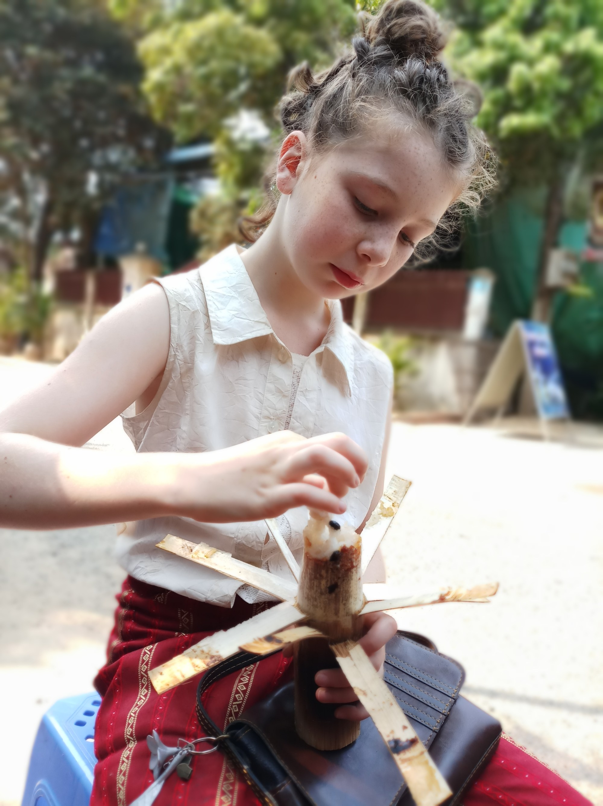 Sold by women on their bikes, it is a savory filling snack that is easy on the stomach, recognizable and inexpensive ($1). In ancient times Angkor soldiers carried this snack with them to eat on the road as it would keep for a few days. Modern day coconut milk does not keep as long.