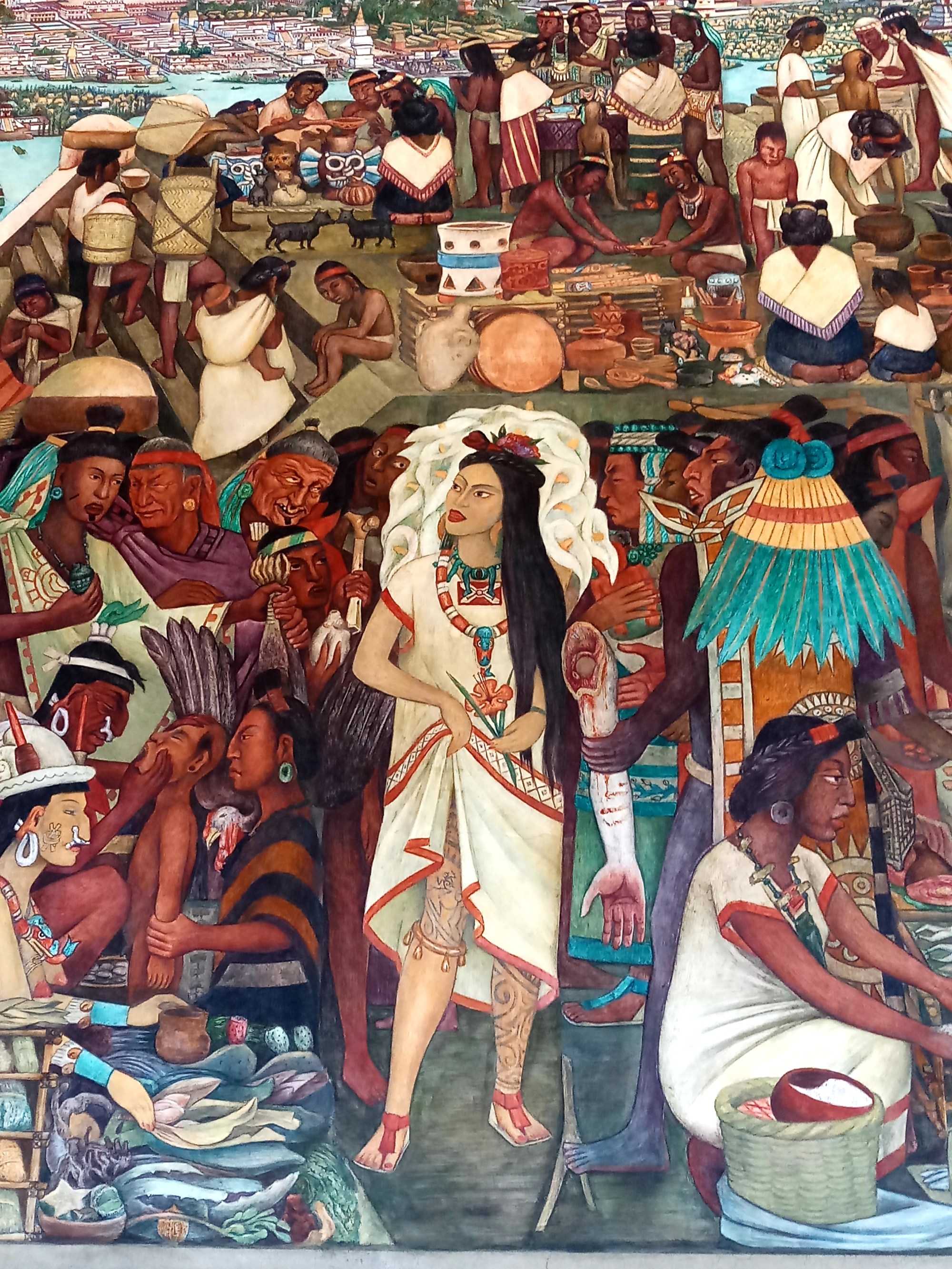 We stood in front of these amazing historical stories painted over a period of years by Diego Rivera. You are just sucked into to the scene, they are alive and dynamic and large, covering the huge walls within the National Palace. At the time of the commission of these murals, the majority of Mexicans could not read. This was a project financed by the Ministry of Education to share with the people their history. Rivera documents the Aztec period all the way to the revolution in 1848. There is so much information and symbolism on these walls.