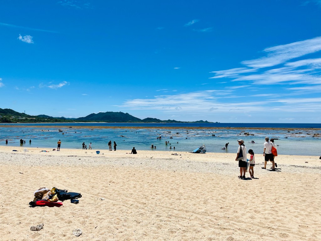 We took two taxis to Yonehara beach, renowned for its off beach snorkeling. We did not have gear but plenty of people were exploring the shallow waters. We found a waist deep pocket of sea that we could submerge and escape the heat.