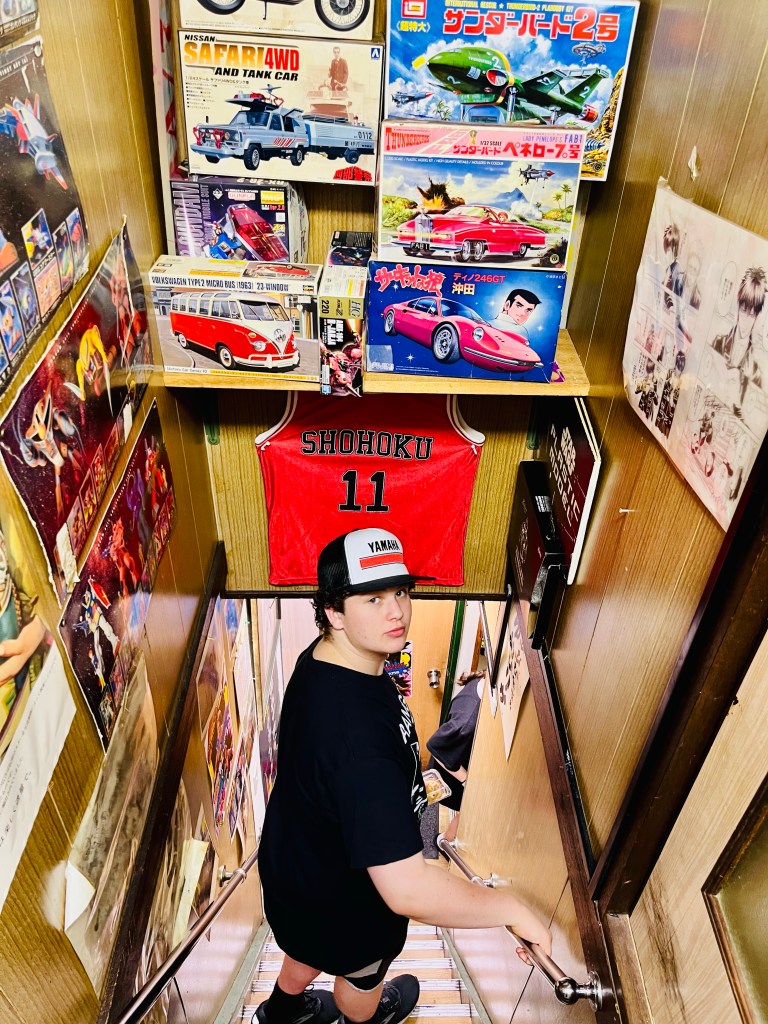 On our first night we found a very small restaurant a short walk from our hotel. It appeared closed, but inside was a bustling small interior decorated densely with manga, action figures, basketball jerseys, every inch filled with colorful paraphernalia of every sort.