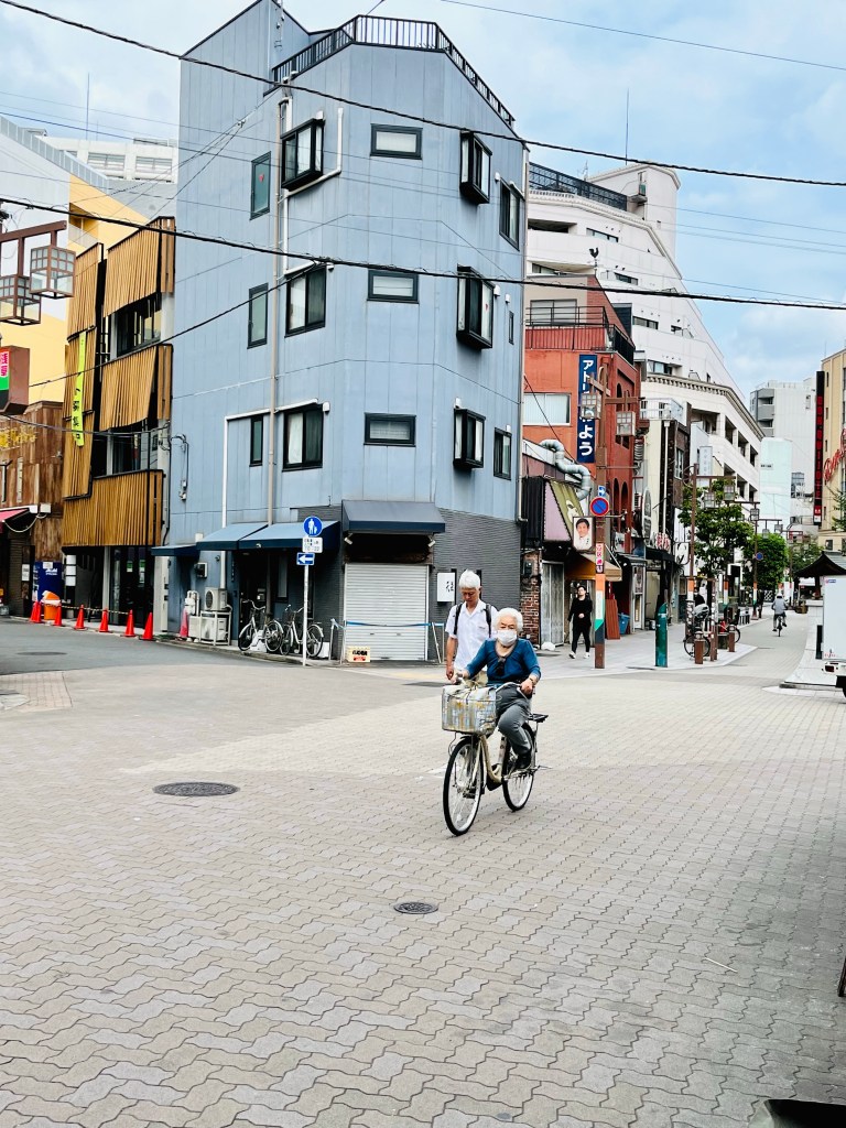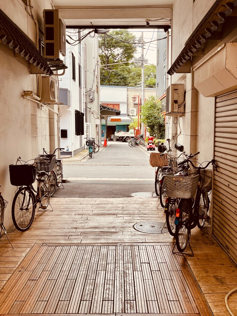We are staying in the Ueno area, which is part of the historical “low city”, working class and modest older buildings. In the evening the neighborhood feels empty and pedestrians wait at crosswalks, abiding by the red no walk signal even though there is no traffic for blocks. Bicycles rule, and easily outnumber cars. They zig-zag through pedestrians deftly, elegant women in professional attire and parents with children in seats in front and back. There are very few helmets among them. The weather is 90 and humid and our number one task is to find dinner and go to sleep after our 20 hr journey from Portland!