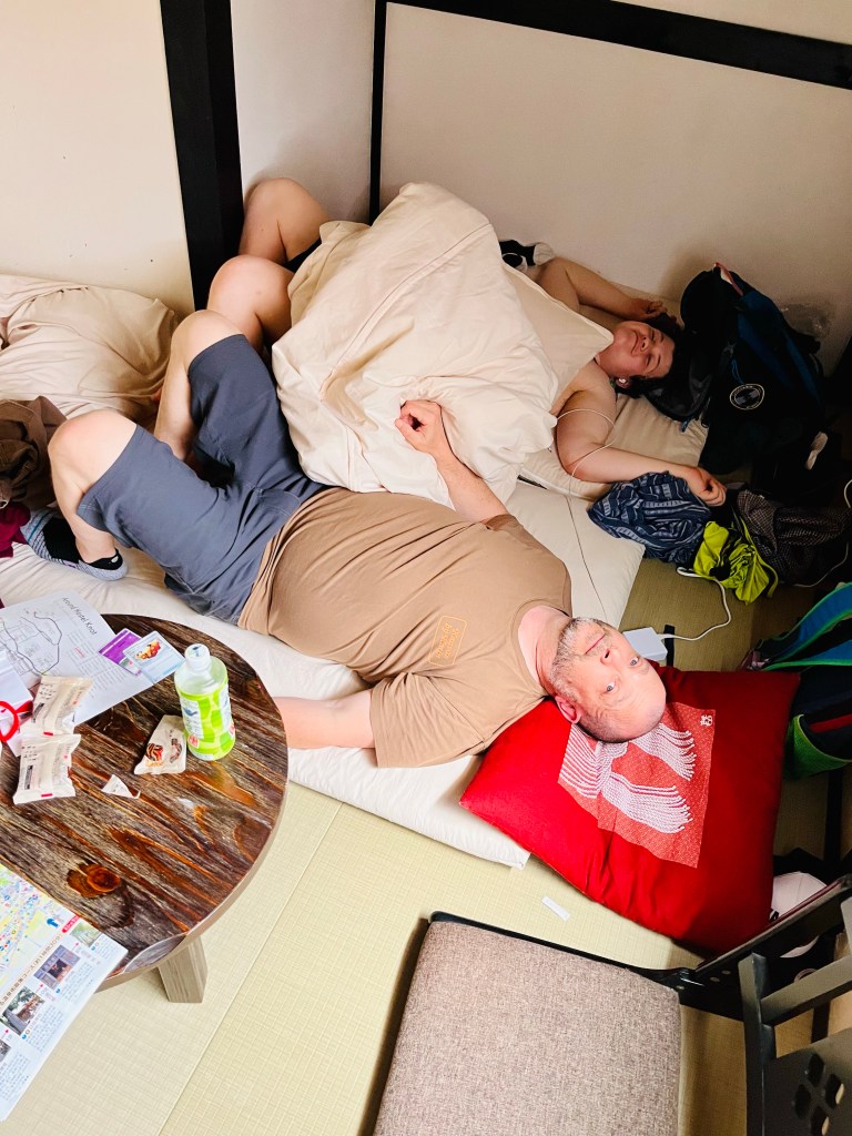 We traveled by train to Shuzenji, about 2 hours south of Tokyo, on the Izu peninsula. Although not far from Tokyo in distance, it is another world. We are staying in a small village that reminds us of both Italy and Nepal, narrow paths and roads, tidy, but older buildings and houses. In Japan the communal spaces are sacred and cared for Our accomadations are a cute friendly hostel that is clean and simple. However, I think I have aged out of communal living and have no desire to make conversation with fellow travelers or share the shower with 10 strangers. Addie and I are sleeping in the female dormitory which is a small room with wooden sleeping capsules. Addie being close to the ideal Japanese stature and body weight is the only one who is comfortable. I have to turn my body every half hour to prevent skin breakdown while sleeping on these very thin futons:)
