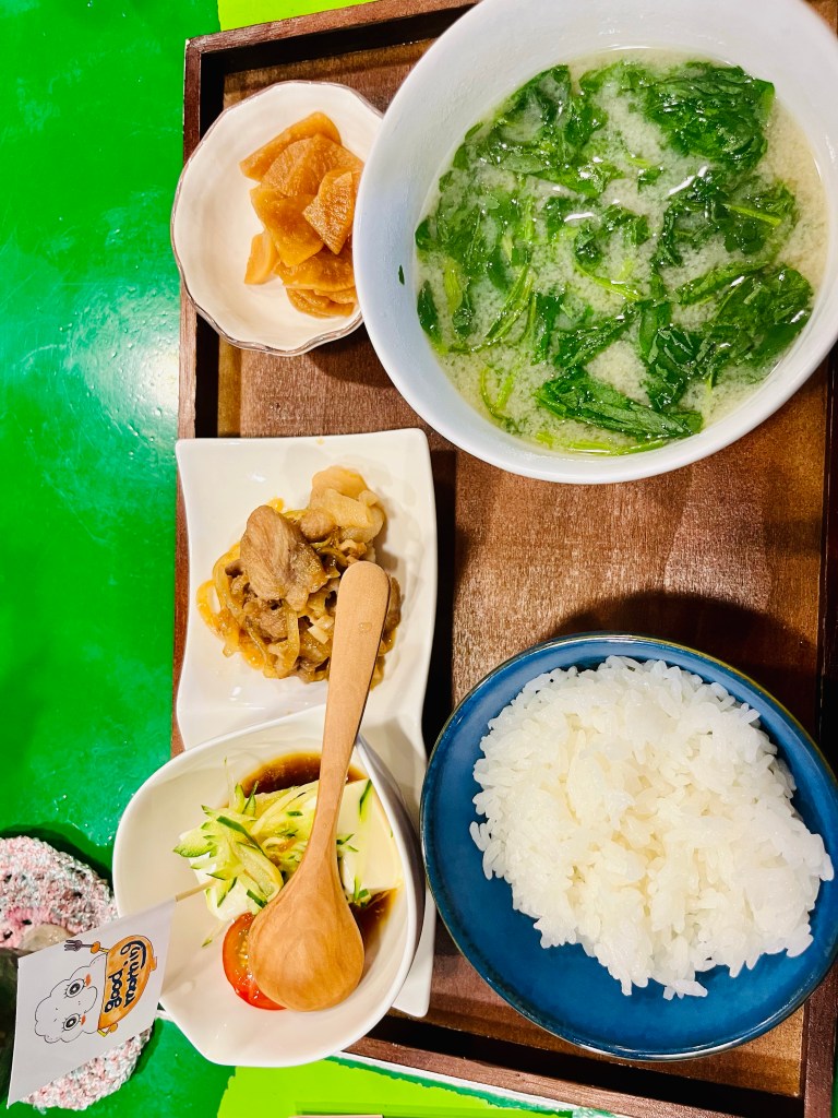 Traditional breakfast of Miso, pickled turnips, fried pork, tofu and rice accompanied by local tea. All three of the staff watched us intently as we ate. I was given a spoon as my chopstick skills were found lacking:)